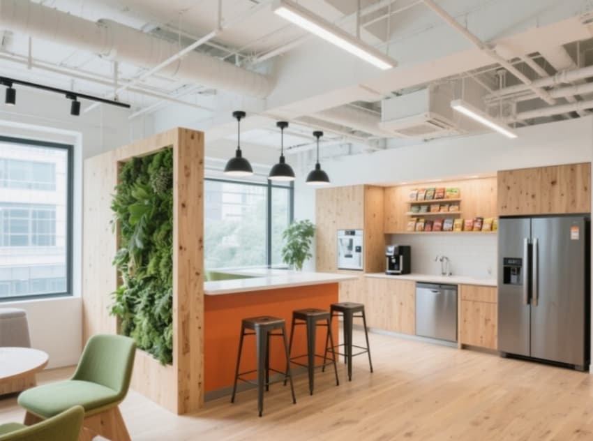 空間大量運用再生木材與微水泥材質,開放式辦公區(qū)的原木長桌嵌入綠植槽,天花裸露的金屬管線噴涂啞光白漆,與定制的弧形布藝沙發(fā)形成材質碰撞。會議室以透明玻璃圍合,墻面裝飾食品插畫與真實食材標本框,休閑區(qū)設置仿真面包造型的洽談凳,茶水間的瓷磚拼貼模擬面包肌理。?