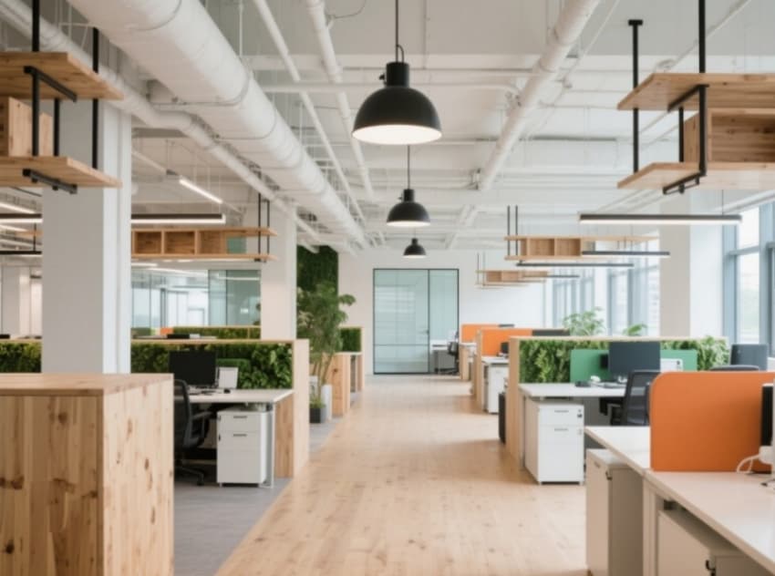 該食品零售公司辦公空間設計,以自然清新的現(xiàn)代輕工業(yè)風格為核心,形成統(tǒng)一且富有行業(yè)辨識度的視覺體系。整體色調提取自食材原生色彩——淺木黃打底,搭配牛油果綠、奶油白與燕麥棕,通過漸變玻璃隔斷與半通透紗簾營造層次分明的柔和光影。?