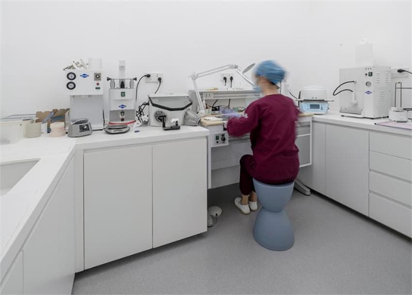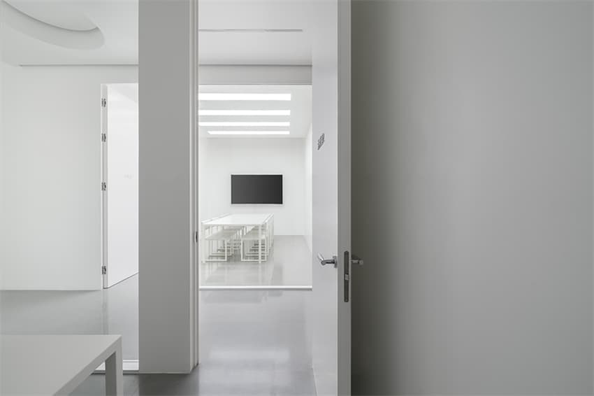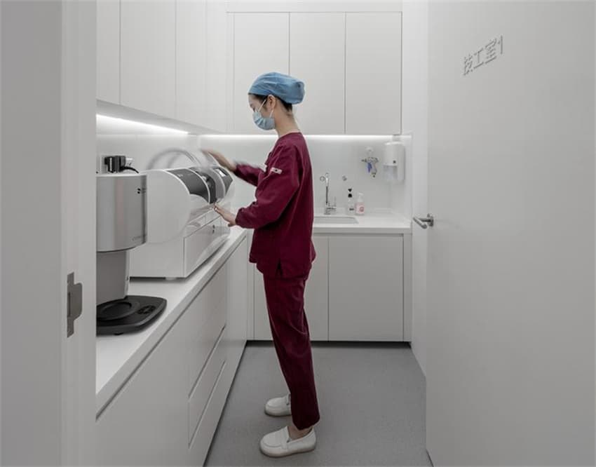 從醫(yī)療項(xiàng)目的屬性出發(fā),主體空間呈現(xiàn)精密機(jī)械般的有序裁切,高效容納專業(yè)而系統(tǒng)的功能布局,在滿足所有繁復(fù)規(guī)范的前提下卻又盡簡示人。延續(xù)純白語匯,診室空間以方歸零,扁平化構(gòu)圖去除任何多余造型,保證操作流線的完整性,保持手術(shù)室級(jí)光環(huán)境的同時(shí),玻璃幕墻采光面引入充足天光和景觀,撫慰治療者的緊張情緒。專業(yè)功能區(qū)基于極端無菌環(huán)境,以無雜質(zhì)的凈襯托工作間儀器與工作狀態(tài)的繁,直線與方塊的組合如同繪畫的白底,當(dāng)一切背景簡化到無以復(fù)加,專業(yè)工作的狀態(tài)自成一件藝術(shù)品。