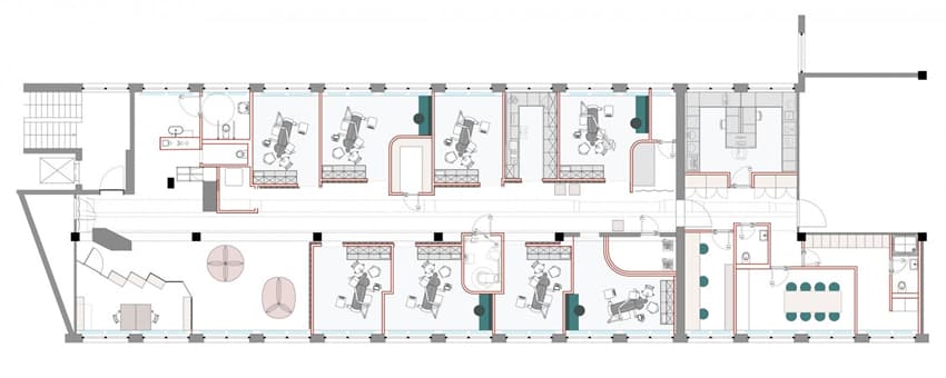 牙醫(yī)診所走廊的凹槽玻璃墻也鑲有條形燈。治療室里,存放牙科工具的櫥柜帶有粉紅色的柜門和彩色斑點(diǎn)的臺面。穿孔的金屬板用來覆蓋沿著外圍墻底部運(yùn)行的散熱器。