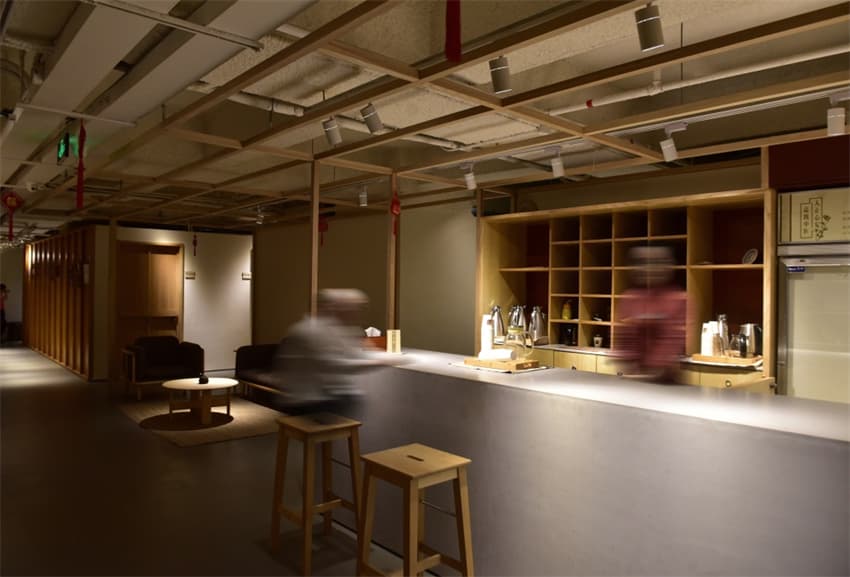 公共客廳的整個(gè)空間通透,不帶有任何鮮明中式符號(hào)化的烙印,“無”形式、“無”修辭,顯出開放與自由。設(shè)計(jì)師未賦予醫(yī)館任何“風(fēng)格”,悉心選擇材料、構(gòu)件,令其中的一器一物成為主體。并通過木架的形式統(tǒng)籌起等候、調(diào)劑、收銀、水吧及展示和宣傳等功能區(qū)。此時(shí)自然質(zhì)樸的實(shí)木條在設(shè)計(jì)師眼中有了新的定義,即是劃分、圍合空間的構(gòu)件,也留給使用者未來宣傳展示、裝飾的一種可能性。