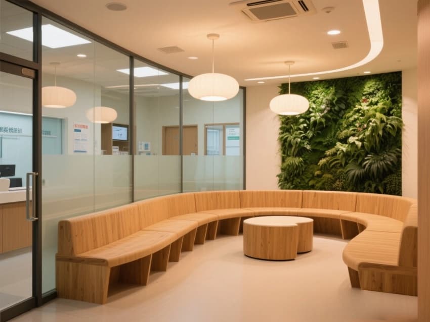 等候區(qū)的設(shè)計也十分貼心,弧形的木質(zhì)座椅和圓形的小茶幾,搭配上綠色的植物墻,營造出一種舒適、放松的氛圍。
