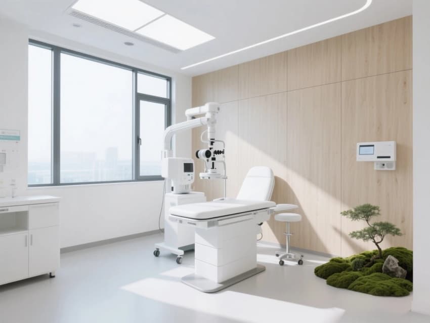 檢查室同樣采用了淺色木質(zhì)墻板,搭配白色的醫(yī)療設(shè)備,顯得專業(yè)且不失溫馨。室內(nèi)還擺放了綠色植物,增添了生機和自然氣息。