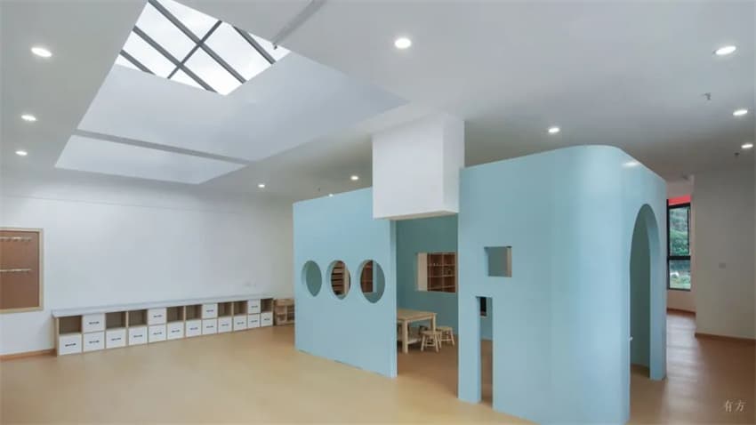 主體建筑物以純白作為主色,在周圍青灰色調(diào)的建筑中脫穎而出,新與舊相映成趣,體現(xiàn)了城市積極的更新關(guān)系,也增添了一份不被世俗捆綁的自由,天空、綠植的本色成為主要的點綴色,孩子們在其中穿行奔跑,抵達山野林間,也是抵達理想的未來。