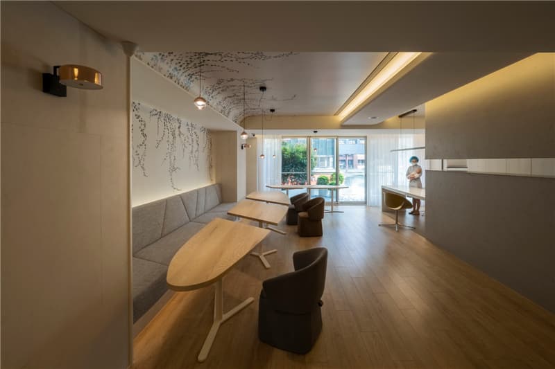 大樓前后臨窗處是媽媽休養(yǎng)房間, 都有陽臺, 綠意環(huán)繞; 洗手枱結(jié)合泡奶功能的弧形中島區(qū)是房間的核心, 中島枱面石材以線條形式延展至床頭, 仿佛母嬰臍帶相連的意象; 天花造型也以弧形呼應柔化空間線條, 弧形床頭背墻以不同粉嫩色圭藻土涂抹出不同肌里; 戶外陽臺的綠意圍繞室內(nèi), 形成空間視覺端景, 也提供媽媽產(chǎn)后有一舒緩且具療愈感的休養(yǎng)空間!