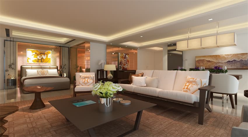 整個(gè)建筑外觀是現(xiàn)代風(fēng)格,配合落地窗是為了保證每個(gè)房間的空間通透性。